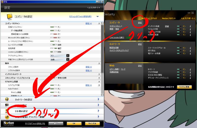 30分間PCを放置してるとノートン先生が、バルス・・・じゃなくて、アイドルタイムアウトとか言いながら勝手にスキャンを開始する ○○○○動画見てたりPSUでハムハムしてても問答無用でノートン先生が勝手にスキャンを開始する そしてPCが酷く重くなる 本来アイドルタイムが終わる(マウス動かしたりする)と、スキャンは停止するはずなんだろうけど・・・ いつまでカタカタカタカタやってんだろうね ルーズ過ぎるノートンほんとウンコだよねウンコ 正直リアルタイムスキャンと手動スキャンだけでいいから、他はいらんことせんで黙ってて欲しいわ そうおもい続けてはや3ヶ月 色々調べてたらクワイエットモードプログラムなるものがある事を知ったのよ そのクワイエットモードプログラムってのは何かっつうと、ソレに指定した実行ファイルが動いてる間はサイレントモードになるってもの つまり、常駐ファイルを指定してやればノートンの馬鹿は一生黙りこけるってわけよ もしかしたら同じ思いをしてる同志がいるかもだから以下に手順でも ノートンインターネットセキュリティ(初めの画面)の設定をクリック その他の設定タブをクリック サイレントモードの設定 - ユーザー指定のプログラムの設定をクリック 後は好きな実行ファイルを選ぶだけ とりあえず自分はメッセとIEとペンタブを指定してみた やってないからわかんないけど、最悪ノートン自身を指定してやれば自縛してくれんのかな? いやーいままでいちいち手動でサイレントモードオンにしてたのが馬鹿みたいだわ 教えてくれた君!ありがとうだぜ!