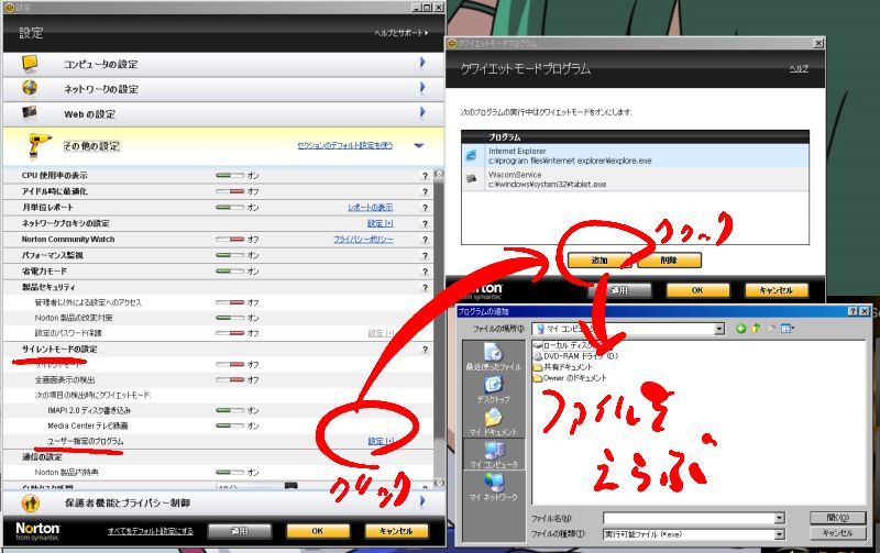 30分間PCを放置してるとノートン先生が、バルス・・・じゃなくて、アイドルタイムアウトとか言いながら勝手にスキャンを開始する ○○○○動画見てたりPSUでハムハムしてても問答無用でノートン先生が勝手にスキャンを開始する そしてPCが酷く重くなる 本来アイドルタイムが終わる(マウス動かしたりする)と、スキャンは停止するはずなんだろうけど・・・ いつまでカタカタカタカタやってんだろうね ルーズ過ぎるノートンほんとウンコだよねウンコ 正直リアルタイムスキャンと手動スキャンだけでいいから、他はいらんことせんで黙ってて欲しいわ そうおもい続けてはや3ヶ月 色々調べてたらクワイエットモードプログラムなるものがある事を知ったのよ そのクワイエットモードプログラムってのは何かっつうと、ソレに指定した実行ファイルが動いてる間はサイレントモードになるってもの つまり、常駐ファイルを指定してやればノートンの馬鹿は一生黙りこけるってわけよ もしかしたら同じ思いをしてる同志がいるかもだから以下に手順でも ノートンインターネットセキュリティ(初めの画面)の設定をクリック その他の設定タブをクリック サイレントモードの設定 - ユーザー指定のプログラムの設定をクリック 後は好きな実行ファイルを選ぶだけ とりあえず自分はメッセとIEとペンタブを指定してみた やってないからわかんないけど、最悪ノートン自身を指定してやれば自縛してくれんのかな? いやーいままでいちいち手動でサイレントモードオンにしてたのが馬鹿みたいだわ 教えてくれた君!ありがとうだぜ!