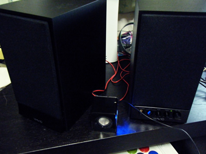 今までおもちゃのスピーカー(写真真ん中)しか持ってなかったから、音楽聴く時はPC→テレビ(アクオス)って繋いで、テレビのスピーカーで音楽流してたんよ